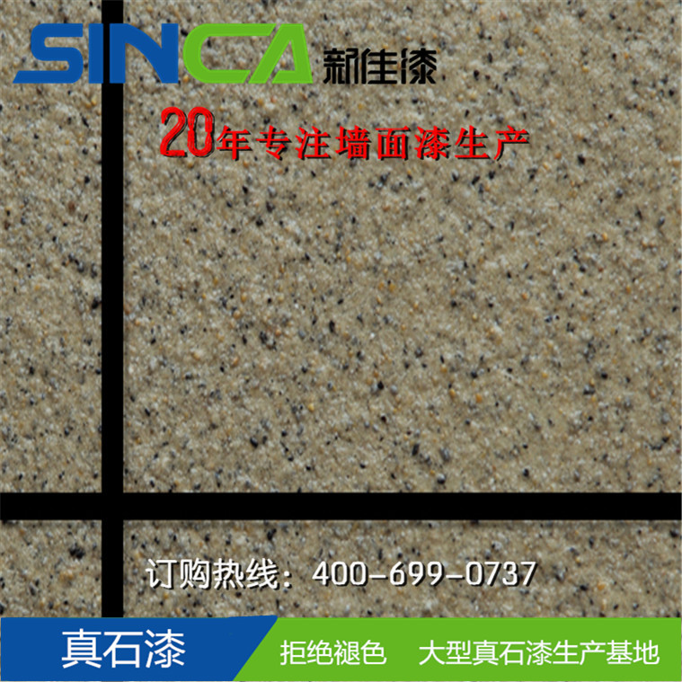 新佳外牆天然真石漆由山東新佳塗料公司精選各種顔色的天然石粉並配以丙烯酸聚合物和進口助劑研制而成,具有天然真實的自然色澤,可以賦予建築物典雅、質樸、自然的高級藝術效果,造型豐富多變,特别适用於曲面建築物上裝飾。外牆天然真石漆具有防火、防水、耐酸堿、耐污染。無毒、無味、粘接力強,永不褪色等特點,适應多種嚴酷的氣候環境,可以爲建築物提供長久的裝飾和保護。由於具備良好的附著力和耐凍融性能 ,因此特别适合在寒冷地區使用。